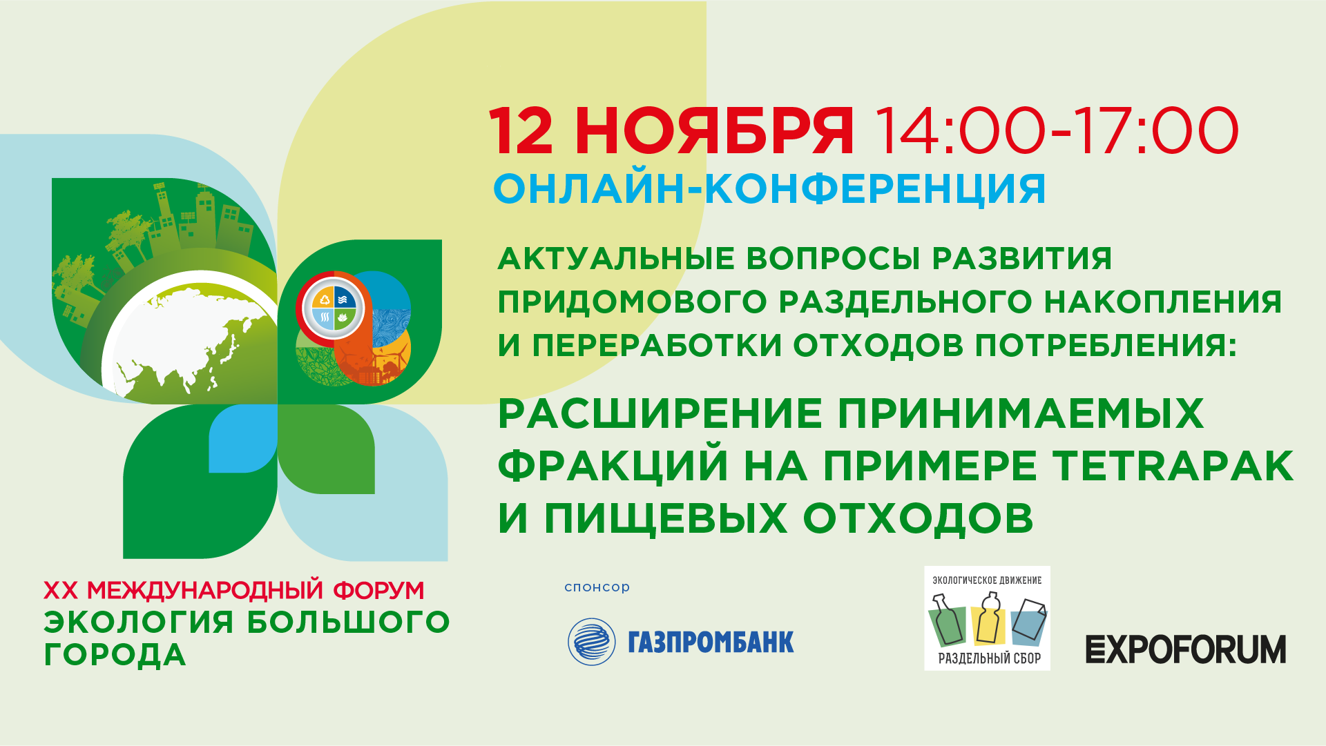 В рамках осенней сессии ХХ Международного форума «Экология большого города» 12 ноября в онлайн-формате состоится круглый стол «Актуальные вопросы развития придомового раздельного накопления и переработки отходов потребления: расширение принимаемых фракций на примере TetraPak и пищевых отходов».